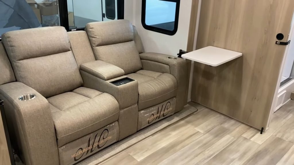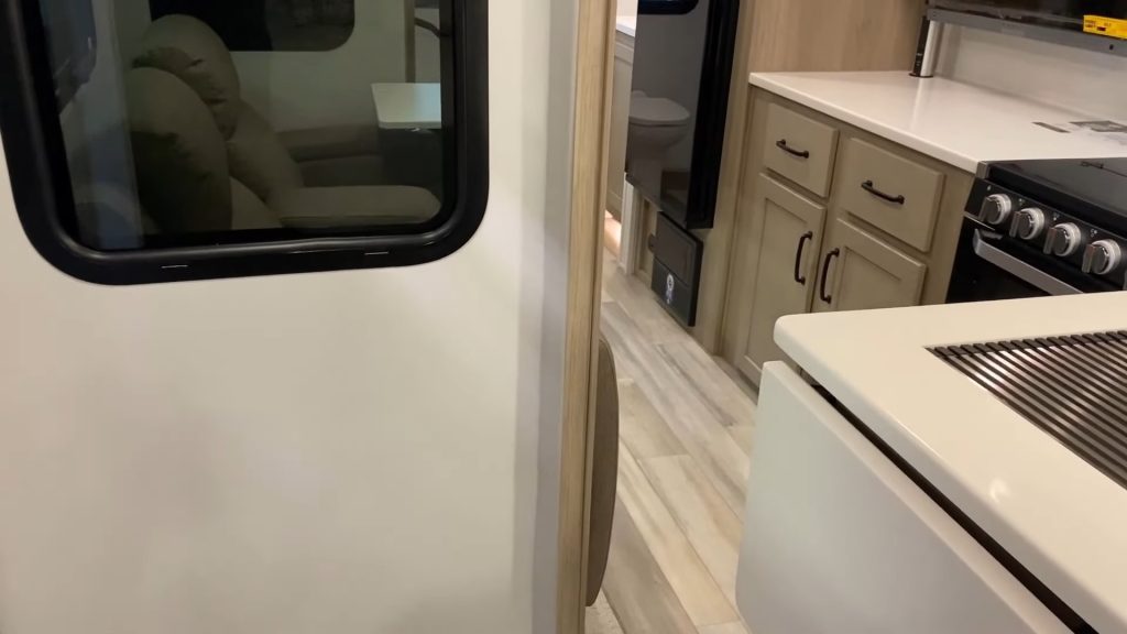 One of the cool things about the Rockwood 2518S is its road mode. The living room slide doesn’t overlap with essential areas, like the bathroom and bedroom. You can easily access these without having to extend the slide, which is a huge plus.