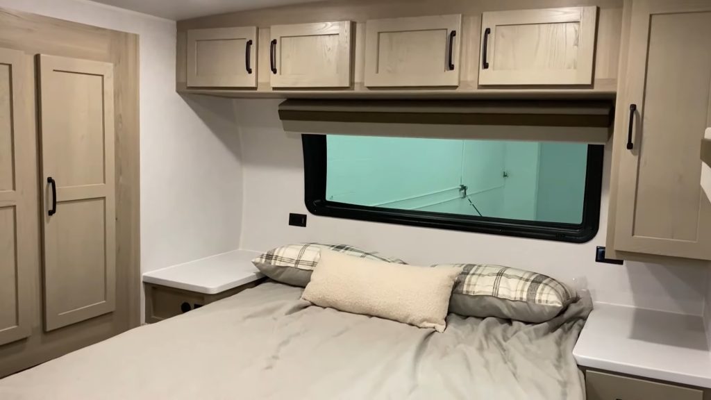 Moving on to the bedroom, you’ll find a short queen bed – 60 inches wide but a tad short at around 74-75 inches long. Now, this might not be everyone’s cup of tea, but there’s room to upgrade if you prefer a true queen-sized bed.