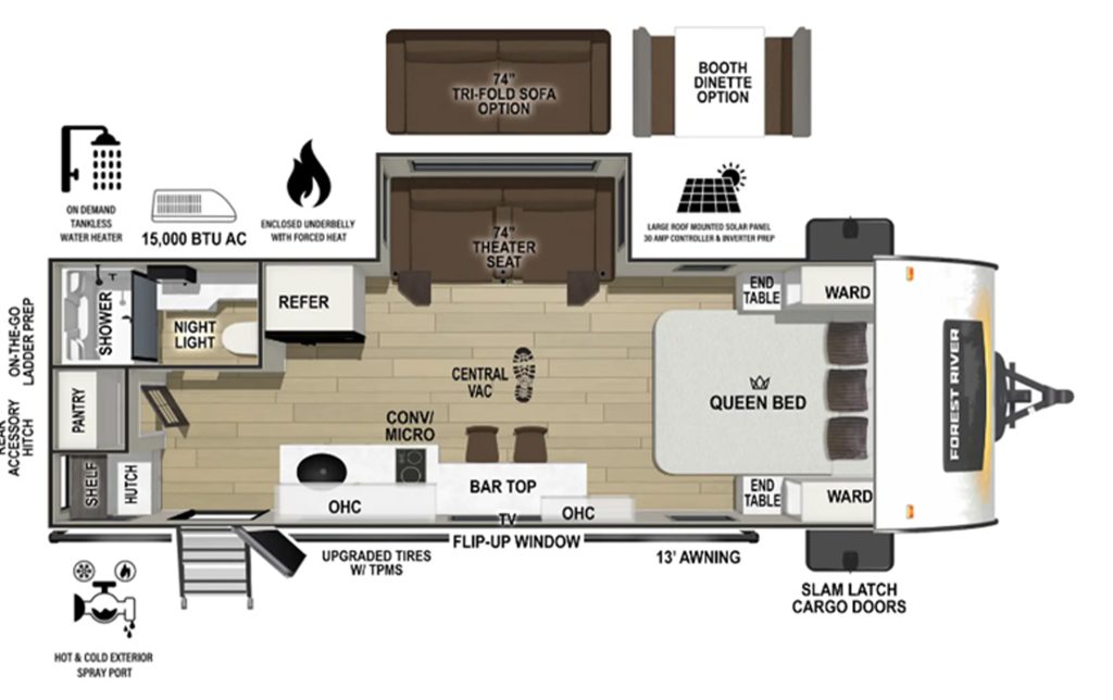 - Front kitchen + rear bed slide in a sub-30’ floor plan