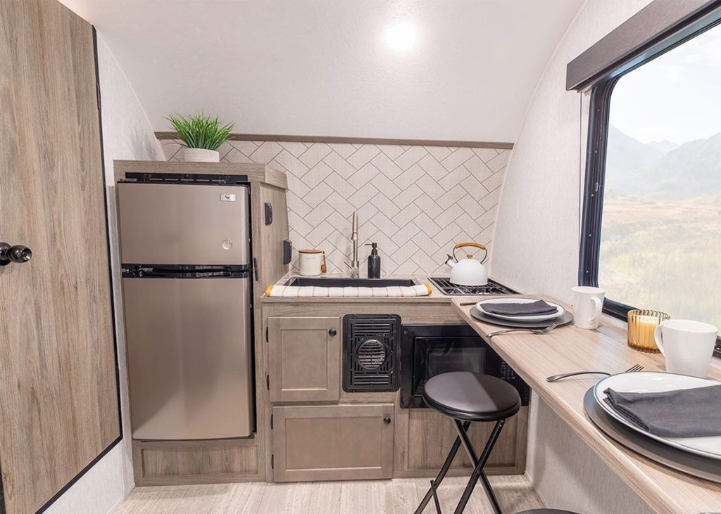 The upgraded bathroom layout, extra counter space, and king bed option make this one of the most well-rounded couples campers on the market.