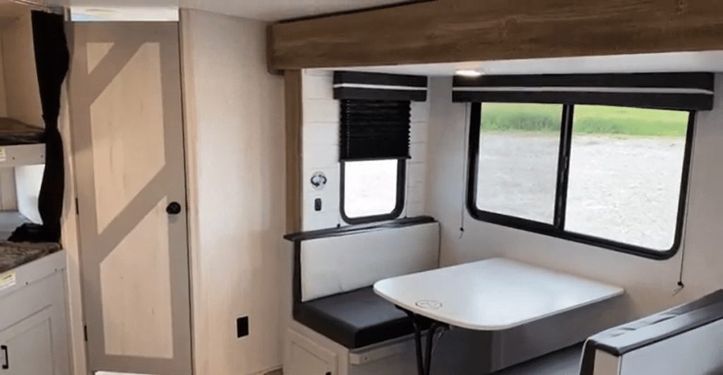 The dinette area uses an, easy too adjust, single-leg table that’s easy to adjust.