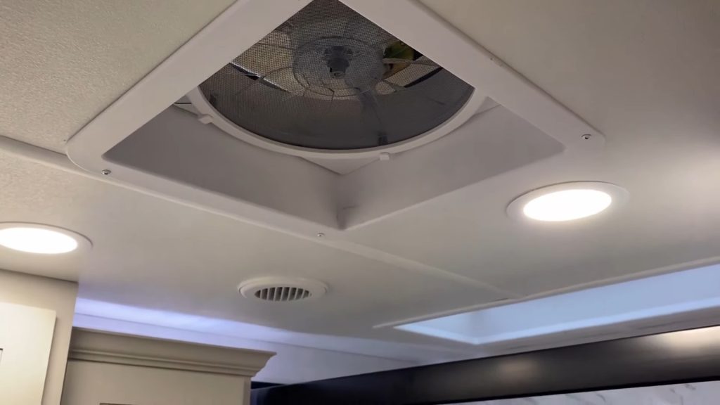 The bedroom in this RV offers a peaceful retreat with options for a king or queen bed. It’s equipped with smart TVs and conveniently placed outlets on both sides of the bed. The air conditioning in the bedroom is part of a mini ducted system, ensuring efficient cooling.