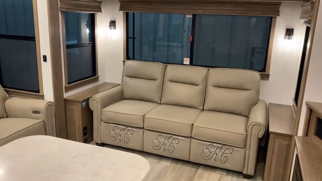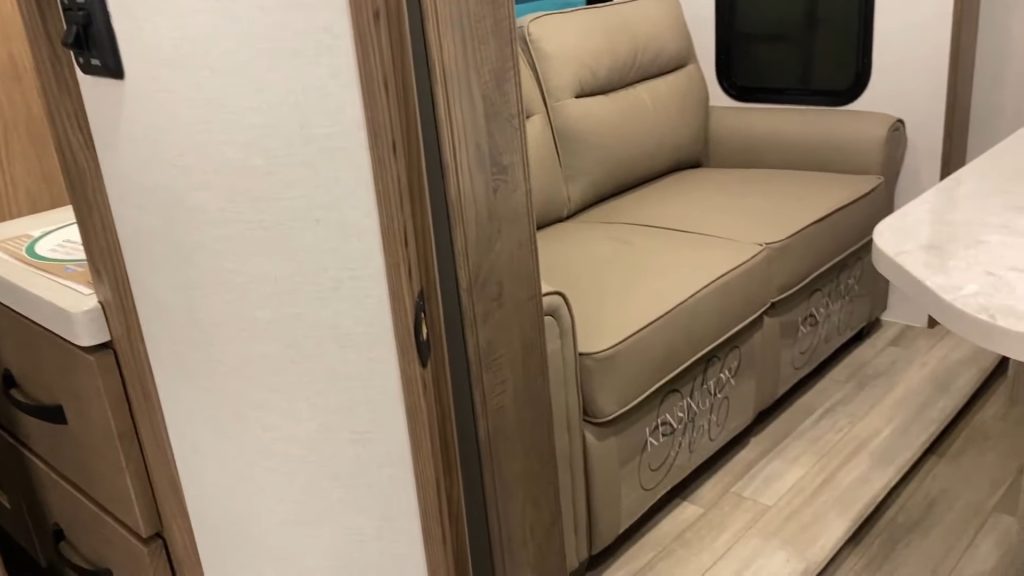 The living room comes with a traditional setup, but with added twists for enhanced comfort and utility. Thanks to the 101″ wide body design this RV is extra roomy.