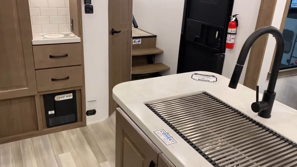 The smart design includes radius edges on countertops to prevent injuries and a symmetrical setup around the stove, making it convenient for both right and left-handed RVers. Plus, there’s a dedicated pantry for additional storage, so all your kitchen essentials are within reach.
