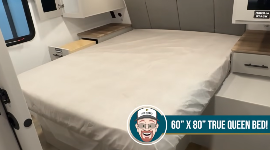 Alliance didn’t treat the front bedroom like a “necessary sacrifice” to make the rest of the trailer work. The 60×80 true queen bed matters more than it sounds on paper, especially for couples who are tired of sleeping diagonally or dealing with shortened mattress setups that feel fine for one night and annoying for five.