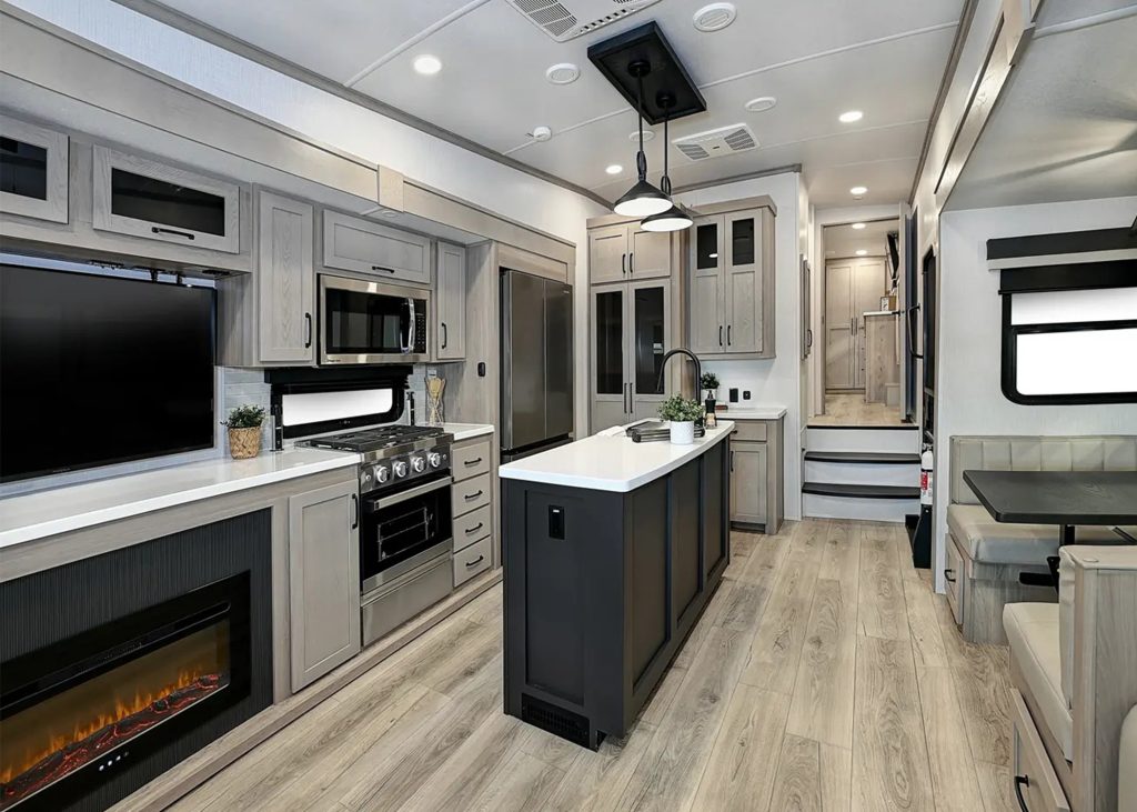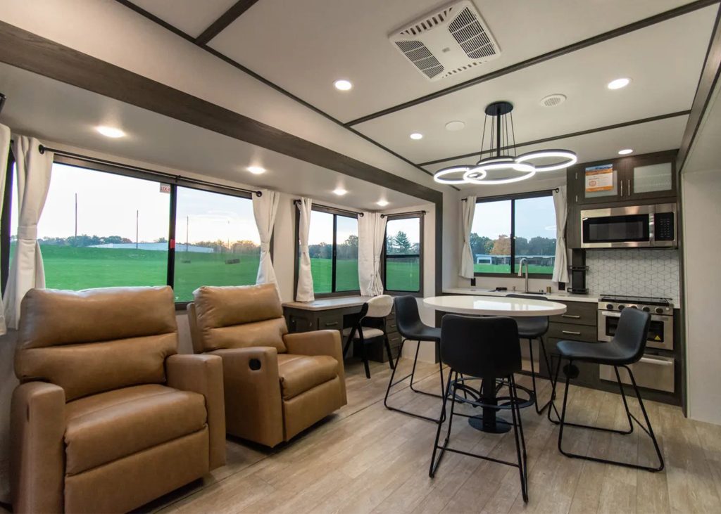 RVers who want a high-end rear kitchen fifth wheel with better-than-average storage, seating, and open living space.