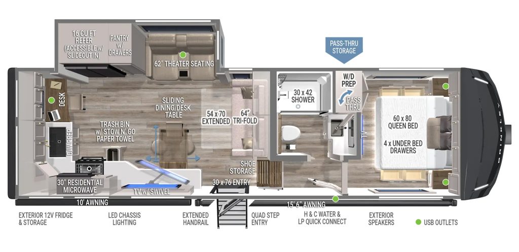 - Full-size fifth wheel features in a compact, 30-foot package