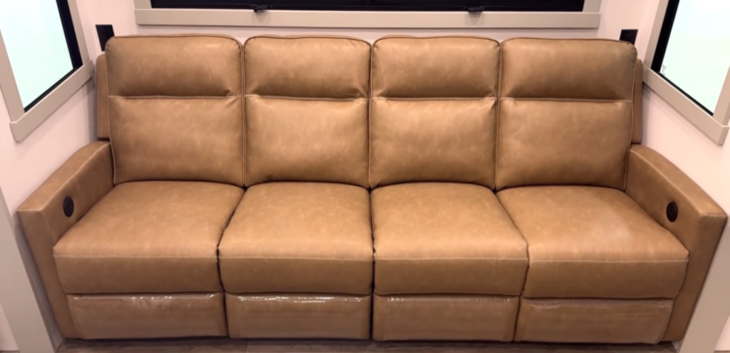 The living room is anchored by a massive sofa with four recliners (heat & massage), and it’s one of those setups that immediately feels luxury when you sit down. All four sections recline, giving everyone a premium seat, and yes, an adult can absolutely stretch out and nap across it on the perfect rainy day. It’s the kind of seating that makes this feel less like a toy hauler and more like a luxury fifth wheel.