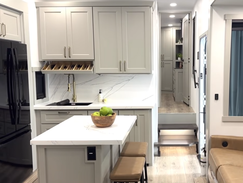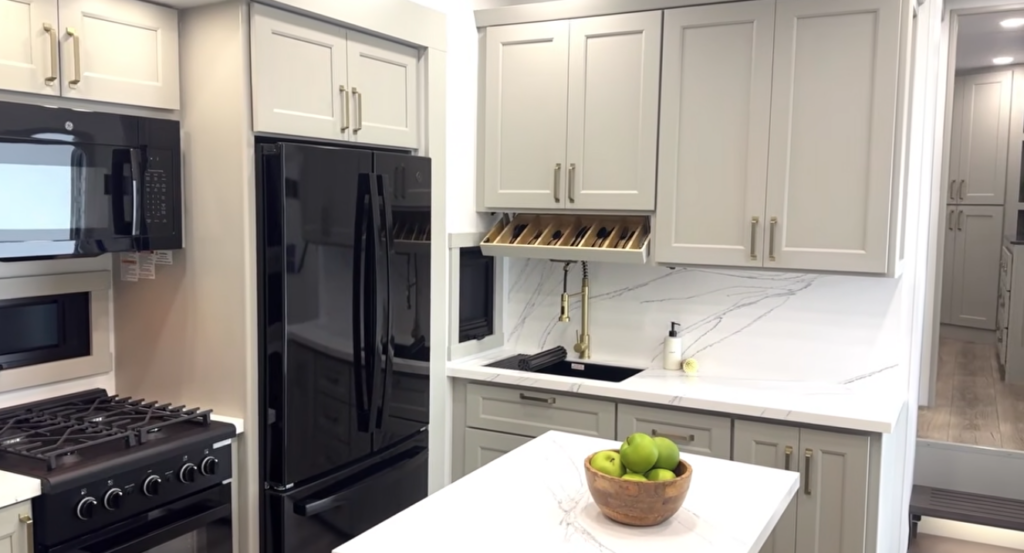 You still get residential solid-surface countertops and backsplash, dovetail drawer construction, and a storage layout that’s built to be used daily.