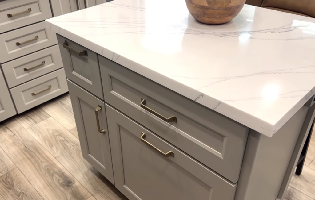 The island storage is smart and functional, including pull-out trash bins and segmented drawers that can be adjusted or removed depending on how you use them. Brinkley clearly understands that kitchen storage has to work for real people, not just look good in pictures!