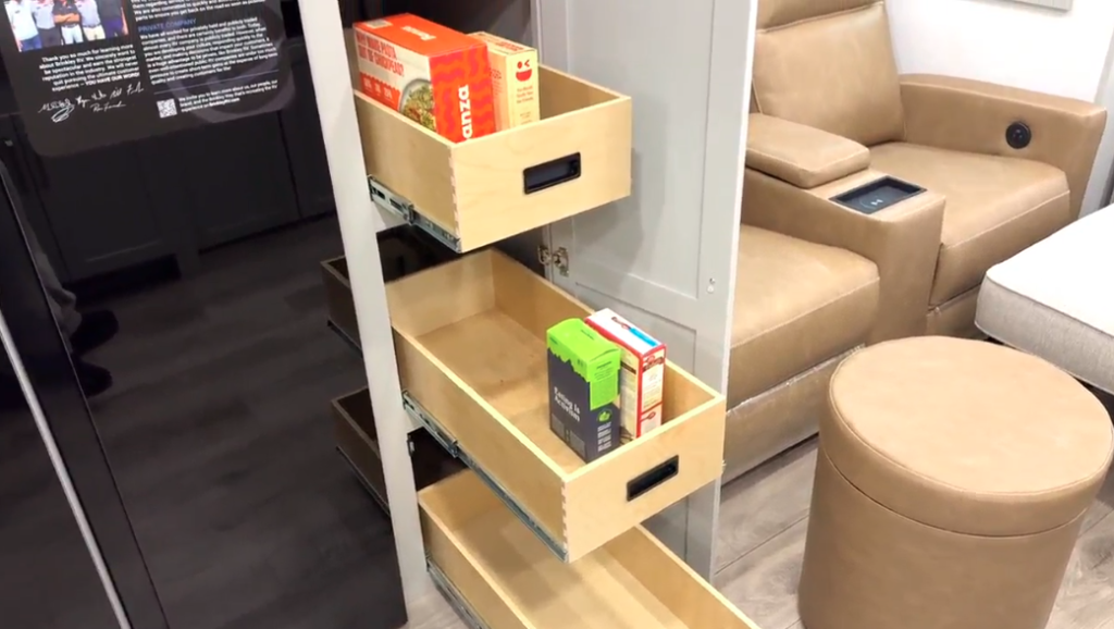 An extra outlet in the pantry? Yes, please! It keeps your space tidy and your specialty appliances powered. Add in the full-extension drawers, and suddenly your morning routine feels a lot more like home – even when you’re busy making memories off grid.