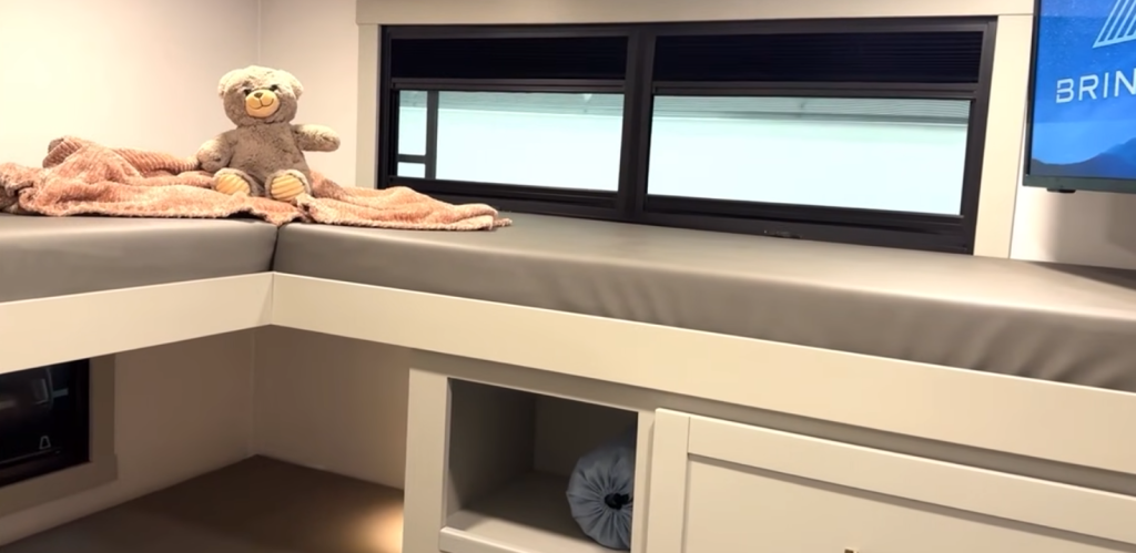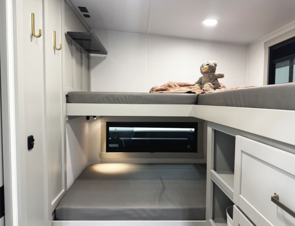 It’s important to note, Brinkley didn’t design this space to be a multipurpose room, it’s not an office, and there’s no washer/dryer prep. Instead, it’s built to do one thing really well, function as a true bunkhouse for family life on the road.