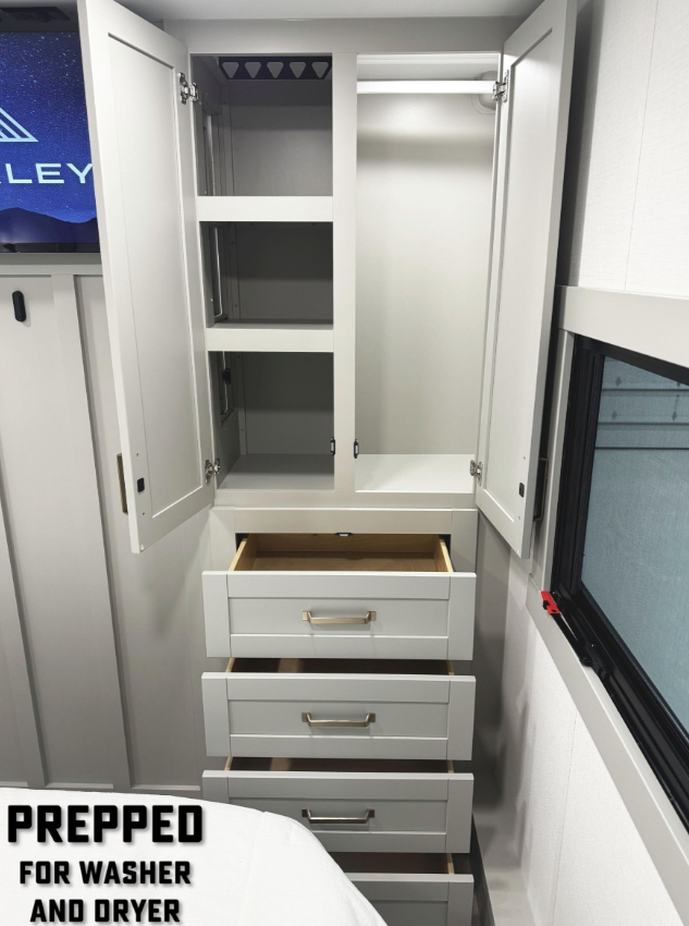 A full wardrobe closet with removable shelves provides flexible organization and is prepped for a washer/dryer should you choose to elevate your travel experience even further.