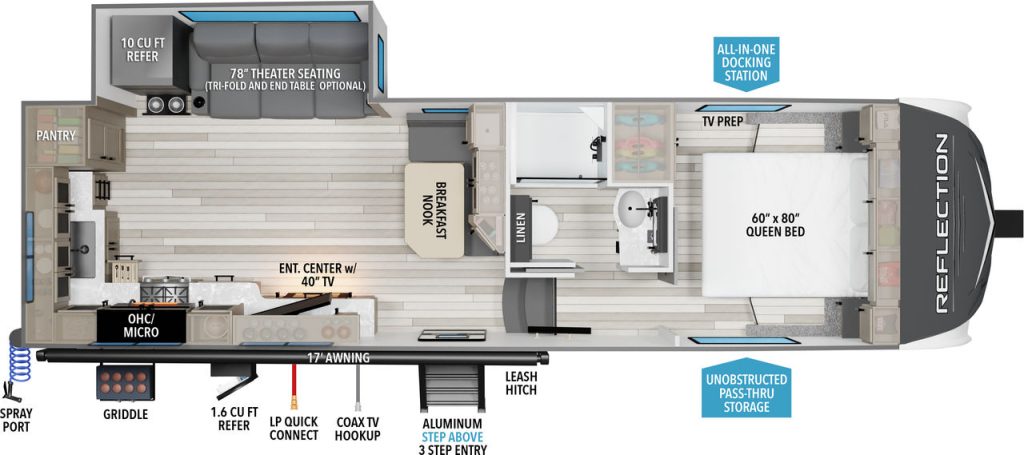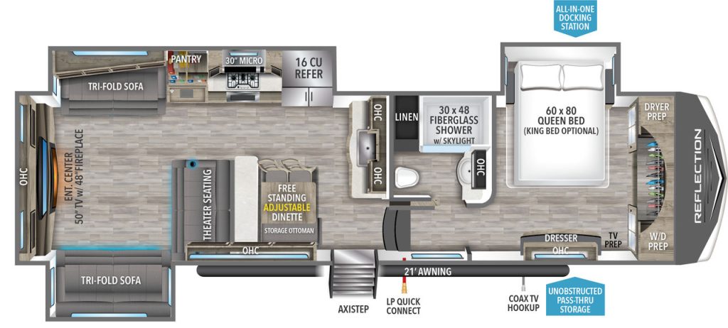 In a Reflection fifth wheel, you’re going to get all the same features you will find in a Reflection travel trailer, but with a few extras.