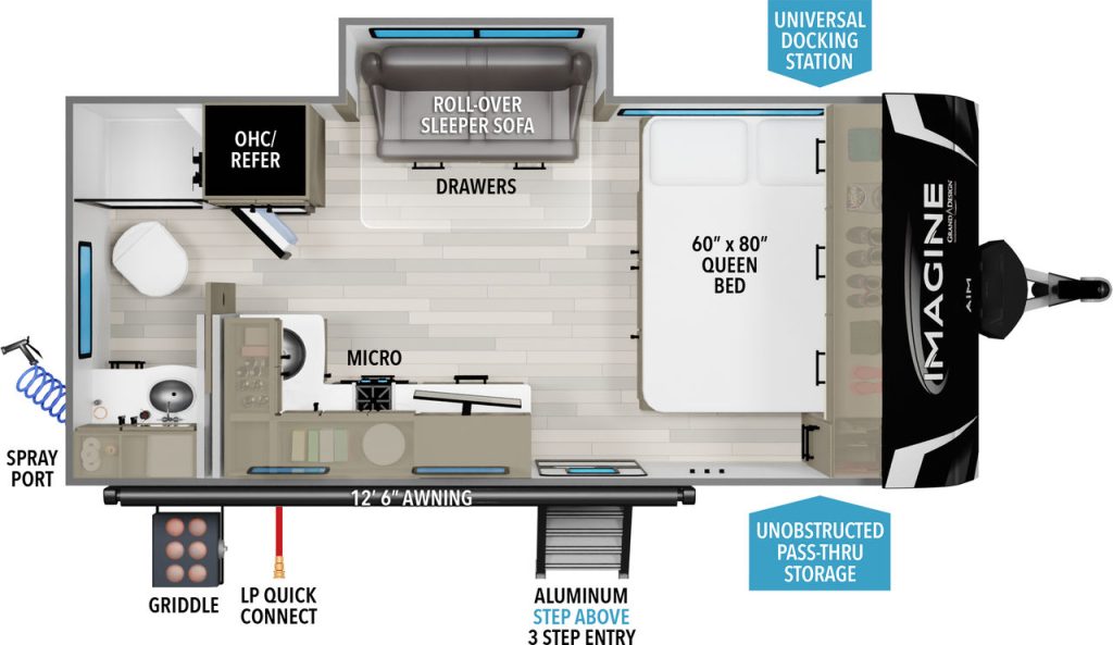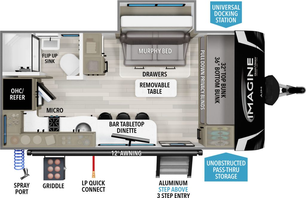 The Grand Design Imagine AIM won RV Business’s 2023 Top RV Debut award, RVPro’s Best New Model award for 2023 RVs, and RV News’ 2023 Lightweight Travel Trailer of the Year Award!
