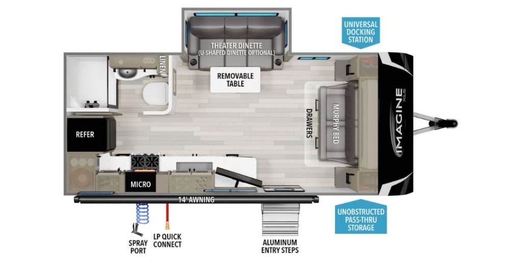 This compact, large kitchen floor plan got started with the Grand Design Imagine 17MKE. It’s since become a staple couple’s camper layout.