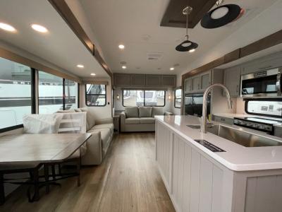 A benchmark chassis creates a space saver upper deck with each one of these Avenue All-Access fifth wheels by Alliance RV! The 101 in. wide-body construction gives you more room to walk around and the flush slide out floors throughout prevent any tripping. There are composite sidewalls inside and out, and PVC roof for extreme durability. You are sure to love no carpet throughout making each Avenue All-Access easy to clean and allergen free, not to mention pet friendly. You can maximize your space throughout with innovative storage solutions like the hidden storage behind the TV, inside the end tables, ottoman, and dinette chairs. These units also include the OTG Solar Package with a 200 watt solar panel, 15 amp MPPT charger, multiple outlets, and more to keep you powered up!