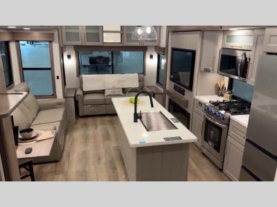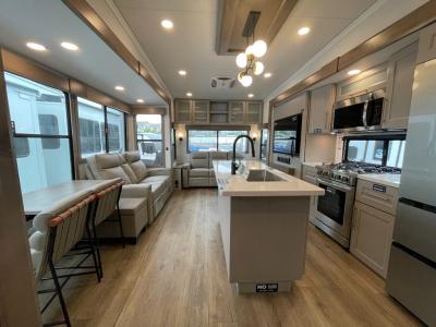 Sleeps 4 Slides 3 Length 40 ft 4 in Ext Width 8 ft 5 in Ext Height 13 ft 6 in Exterior Color Standard Paint/Graphics. Optional Full-Body Paint; Gold, Black Hitch Weight 2664 lbs GVWR 18000 lbs Dry Weight 14908 lbs Fresh Water Capacity 98 gals Grey Water Capacity 106 gals Black Water Capacity 106 gals Tire Size 16" Furnace BTU 40000 btu Available Beds King Refrigerator Type 12 Volt Residential Refrigerator Size 19 cu ft Cooktop Burners 4 Shower Size 61" x 30" Number of Awnings 2 Axle Weight 7000 lbs LP Tank Capacity 60 lbs Water Heater Capacity 12 gal Water Heater Type Gas/Electric AC BTU 40500 btu TV Info LR 50" Smart TV, BR Smart TV Awning Info Friction-Hinge Adjustable Solera with Manual Override and LED Lights Axle Count 2 Washer/Dryer Available Yes Shower Type Standard Electrical Service 50 amp Similar Fifth Wheel Floorplans