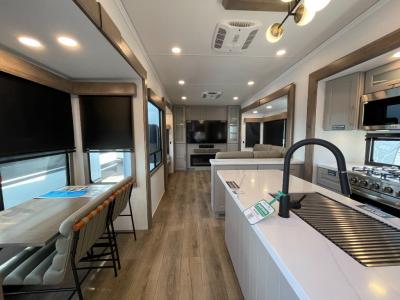 You'll love everything about this luxurious fifth wheel! There are five slide outs so you can enjoy more space than ever, and the rear living area can double as a den for guest. They can sleep on the sleeper sofa or second sofa with overhead storage, and there is a dual recliner across from the 65" Smart TV. The middle kitchen includes a kitchen island with dishwasher prep, generous counter space, a pantry and hutch for storage, and a swivel table and desk to dine or work at! This model also includes a spacious full bath with a large 61" x 30" shower for all-around comfort plus a front private bedroom with a king bed slide out. There is also a walk-in closet with washer and dryer prep, a flip top dresser with a Smart TV, and a seat with storage to keep everything tidy!