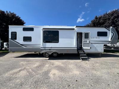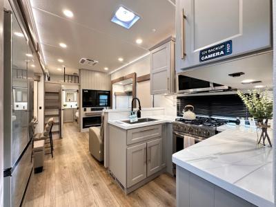Sleeps 8 Slides 4 Length 42 ft 6 in Ext Width 8 ft 5 in Ext Height 13 ft 6 in Exterior Color Standard Paint/Graphics. Optional Full-Body Paint; Gold, Black Hitch Weight 3179 lbs GVWR 18000 lbs Dry Weight 15278 lbs Fresh Water Capacity 98 gals Grey Water Capacity 159 gals Black Water Capacity 106 gals Tire Size 16" Furnace BTU 40000 btu Available Beds King, Queen Refrigerator Type 12 Volt Residential Refrigerator Size 19 cu ft Cooktop Burners 4 Shower Size 48" x 30" and 30" x 36" Number of Awnings 2 Axle Weight 7000 lbs LP Tank Capacity 60 lbs. Water Heater Capacity 12 gal Water Heater Type Gas/Electric AC BTU 40500 btu TV Info LR 50" Smart TV, BR Smart TVs Awning Info Friction-Hinge Adjustable Solera with Manual Override and LED Lights Washer/Dryer Available Yes Shower Type Standard Electrical Service 50 amp Similar Fifth Wheel Floorplans