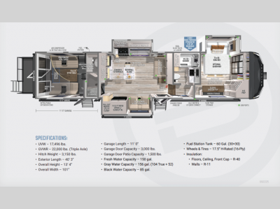Sleeps 8 Slides 3 Length 40 ft 3 in Ext Width 8 ft 5 in Ext Height 13 ft 4 in Interior Color Sahara Exterior Color Optional Full-Body Paint; Silver & Black, White & Black, Gold & Black, Metallic Hitch Weight 3150 lbs GVWR 22000 lbs Dry Weight 17496 lbs Fresh Water Capacity 150 gals Grey Water Capacity 156 gals Black Water Capacity 85 gals Tire Size 215/75 R17.5 Furnace BTU 35000 btu Generator FlexPower 5500 Fuel Capacity 60 gals Number Of Bunks 1 Available Beds King Refrigerator Type GE Energy Star with Ice Maker and Filtered Water Refrigerator Size 19 cu ft Convection Cooking Yes Cooktop Burners 4 Shower Size 30" x 42" Number of Awnings 4 Axle Weight 7000 lbs Garage Size 11 ft LP Tank Capacity 30 lbs Water Heater Type Tankless AC BTU 40500 btu TV Info LR 50" Smart TV, Garage 43" Smart TV, BR 32" Smart TV Awning Info 9', 10' 6", 15', and Rear Patio Power w/Neon Lights Axle Count 3 Washer/Dryer Available Yes Number of LP Tanks 2 Shower Type Standard Electrical Service 50 amp Solar Wattage 800 watts Similar Toy Hauler Fifth Wheel Floorplans