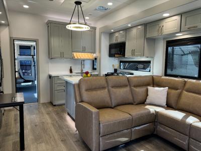 Whether you use this toy hauler to haul your favorite ride-on toys or as a mobile office, you're sure to love every inch of it! The 11' garage includes a Fold-N-Stow table and independent dual sofas, along with a full bath and a loft/storage with a twin bed for more sleeping space. The middle kitchen is every chef's dream with its GE appliances, kitchen island, and convenient features, such as pull-out trash bins and a cutting board, a pull-down knife rack and utensil tray, and a pull-out pantry/utility closet! Right next to the kitchen is the living room with a L-sofa, a 65" Phillips Smart TV and a fireplace, plus a convertible dining table/L-desk where you can dine or get some work done. You'll love the second full bath up front close to the private bedroom, and here, you'll find a king bed slide out, under-bed storage drawers and motion lights, a walk-in closet with cordless vacuum prep, and a sliding dresser top with hidden storage for valuables. There is also washer and dryer prep in the bedroom and garage, making this toy hauler full-time capable!