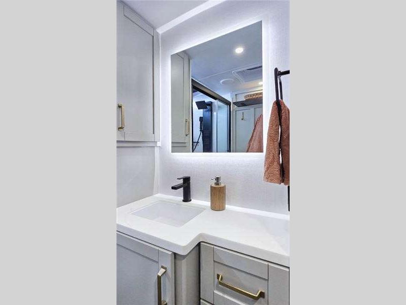 Sleeps 3 Slides 2 Length 33 ft 11 in Ext Width 8 ft Ext Height 11 ft 9 in Int Height 7 ft Hitch Weight 890 lbs GVWR 12995 lbs Dry Weight 9591 lbs Fresh Water Capacity 62 gals Grey Water Capacity 120 gals Black Water Capacity 40 gals Tire Size 225/75R16 Furnace BTU 35000 btu Available Beds Queen Refrigerator Type 12V Refrigerator Size 16 cu ft Cooktop Burners 3 Shower Size 30" x 42" Number of Awnings 2 Axle Weight 6000 lbs LP Tank Capacity 30 lbs. Water Heater Type Tankless On Demand AC BTU 36000 btu TV Info LR 42" Smart Televator TV; BR 32" Smart TV Awning Info 10' and 12' Axle Count 2 Washer/Dryer Available Yes Number of LP Tanks 2 Shower Type Standard Solar Wattage 370 watts Similar Floorplans