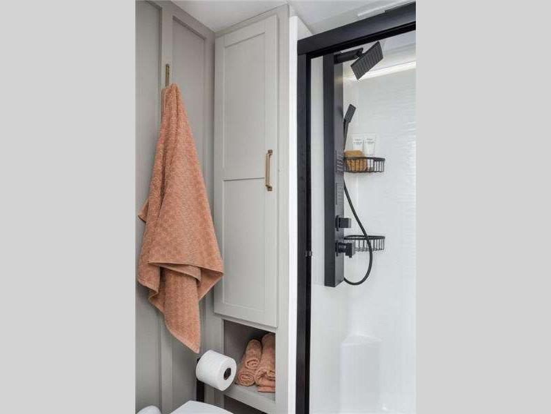The Model Z features wide stance leveling jacks for easy set-up, an automotive grade front cap, lights and lens for a superb upscale look and feel. It also features industry first brass plumbing connections, quad entry solid steps with motion lights, and two outside hot/cold showers! On the inside, clean lines and a modern look that is both warm and inviting. There is ample storage both inside and out with tons of overhead cabinets, drawers and shelves.