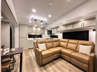 Featuring a spacious L-sofa with four recliners and a 65” articulating TV for endless entertainment, this fifth wheel is a great option to get on the road! The convertible dining table/L desk seats up to four people, making it perfect for meals, work, or play. You can cozy up by the fireplace and enjoy quality time with loved ones. Plus, ample shoe storage keeps your gear organized. The kitchen is equipped with solid surface countertops, dishwasher prep, a residential microwave, and a three-burner cooktop. Also, the large pantry with pull-out drawers provides ample storage for your favorite ingredients and cooking essentials. The one-piece fiberglass shower is a highlight of the bathroom, offering a convenient space to get ready, and additional storage is provided by the linen closet. And you will love the front main bedroom featuring a residential queen memory foam mattress with nightstands, outlets, and USB & USB-C ports for convenient charging.