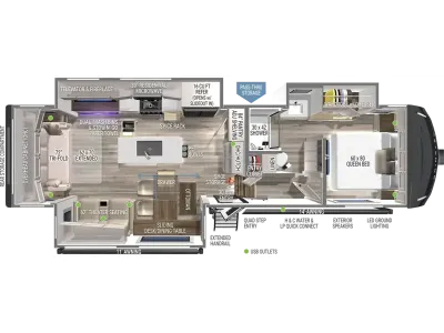Sleeps 4 Slides 3 Length 32 ft 11 in Ext Width 8 ft Ext Height 13 ft 3 in Exterior Color Silver, White or Gold Full Body Paint Hitch Weight 2193 lbs GVWR 14495 lbs Dry Weight 11985 lbs Fresh Water Capacity 75 gals Grey Water Capacity 90 gals Black Water Capacity 45 gals Tire Size 215/75 R17.5 Furnace BTU 35000 btu Available Beds Queen Refrigerator Type 12V Refrigerator Size 16 cu ft Cooktop Burners 3 Shower Size 30" x 42" Number of Awnings 2 Axle Weight 7000 lbs LP Tank Capacity 30 lbs Water Heater Type Tankless On Demand AC BTU 31500 btu TV Info LR 50" Telescoping TV, BR 32" Smart TV Awning Info 11' and 14' Electric w/Neon COB/Dotless LED Lighting Axle Count 2 Number of LP Tanks 2 Shower Type Standard Solar Wattage 370 watts Similar Fifth Wheel Floorplans