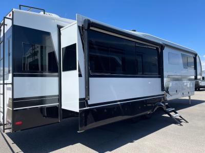 Sleeps 8 Slides 4 Length 41 ft 9 in Ext Width 8 ft Ext Height 13 ft 4 in Int Height 6 ft 8 in Exterior Color Silver, White or Gold Full Body Paint Hitch Weight 2591 lbs GVWR 17695 lbs Dry Weight 14859 lbs Fresh Water Capacity 75 gals Grey Water Capacity 90 gals Black Water Capacity 45 gals Tire Size 215/75 R17.5 Furnace BTU 35000 btu Number Of Bunks 1 Available Beds King Refrigerator Type 12V Energy Efficient Refrigerator Size 16 cu ft Cooktop Burners 3 Shower Size 30" x 42" Number of Awnings 2 Axle Weight 8000 lbs LP Tank Capacity 30 lbs. Water Heater Type Tankless On Demand AC BTU 45000 btu TV Info LR 50" Telescoping TV, Bonus Room 50" Smart TV, BR 32" Smart TV Awning Info 11' & 21' w/LED Lighting Axle Count 2 Washer/Dryer Available Yes Number of LP Tanks 2 Shower Type Standard Solar Wattage 370 watts Similar Fifth Wheel Floorplans