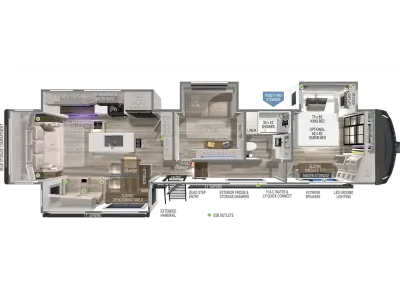This unit is perfect for your family that needs sleeping space for eight! There is ample seating with a sliding desk/dining table, 62" theater seating, and a 72" tri-fold sofa along the rear wall. You can easily relax and enjoy the telescoping TV with a cozy fireplace below. The kitchen offers all that you need to prepare and cook meals just like home with a 16 cu. ft. refrigerator for your perishables, a 30" residential microwave oven, and three burner range top and oven. You will love the kitchen island all outfitted with pull-out pet bowls and double pull out trash bins with an integrated Stow & Go paper towel holder. There is also an 84" pantry with adjustable shelves for all of your canned and dry goods. Mid-coach, just ahead through the main entry, is a bonus room that can be used as a bedroom featuring a sofa bed with flip-up overhead bunk and trundle below, or an office with pull-out desk so that you can work easily while you travel, or it could also be used as a gaming room since there is also a 50" Smart TV. Head up the steps to a bathroom on your left and a private master suite with king bed slide all the way up front. A sliding dresser top features hidden storage which is perfect for jewelry and other personal belongings. The front wardrobe features mirrored doors and the corner closet has been prepped for a stackable washer and dryer if you choose to add that option.