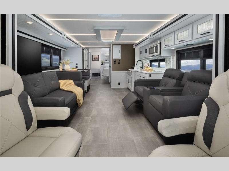 Sleeps 7 Slides 3 Length 41 ft 1 in Ext Width 8 ft 6 in Ext Height 12 ft 10 in Interior Color Chiffon, Sandcastle Exterior Color Red Rock Canyon Full Body Paint, Royal Gorge, Waimea Canyon Hitch Weight 10000 lbs GVWR 32000 lbs Fresh Water Capacity 89 gals Grey Water Capacity 104 gals Black Water Capacity 52 gals Tire Size 22.5" Furnace BTU 40000 btu Generator 8.0kW Diesel Fuel Type Diesel Engine ISB Cummins Rear Diesel Chassis Raised Rail Freightliner Horsepower 360 hp Fuel Capacity 100 gals Wheelbase 266 in Number Of Bunks 2 Available Beds King Torque 800 ft-lb Refrigerator Type Residential Stainless Steel Cooktop Burners 2 Shower Size 38" x 26", 38" x 30" Number of Awnings 1 Axle Weight Front 12000 lbs Axle Weight Rear 20000 lbs LP Tank Capacity 84 lbs Water Heater Type On Demand AC BTU 30000 btu TV Info LR 50" Smart TV, BR 32" Smart TV, Ext. TV Awning Info 18' Power Washer/Dryer Available Yes Gross Combined Weight 42000 lbs Shower Type Standard Electrical Service 50 amp Similar Floorplans
