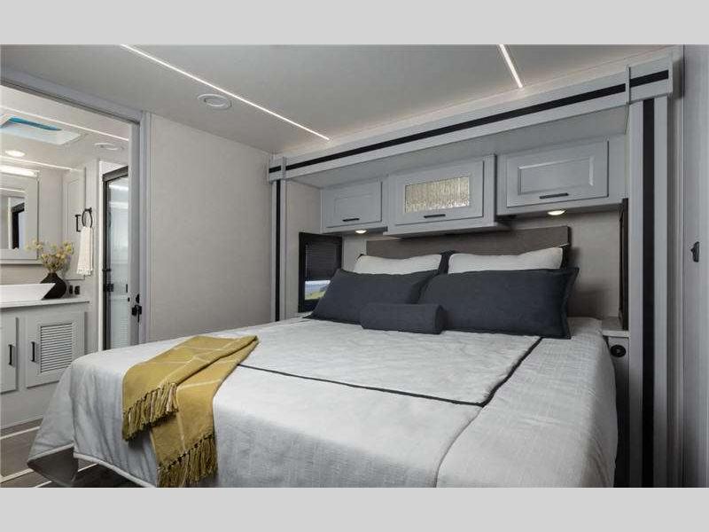 Ride high with the air ride suspension and air brakes, and set up easy with the fully automatic leveling jacks. There are practical innovations like the true flat floor bedroom design to eliminate climbing over the engine cover to get into bed, the side opening huge pass-through storage area on the outside for easy access to your supplies, and the smart design of the interior storage so you can bring what you want. You can gaze out at your beautiful sceneries every where you go with the frameless tinted windows that provide a panoramic view!