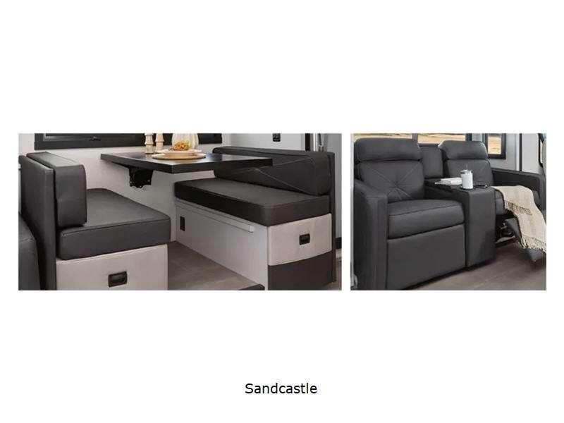 Sleeps 6 Slides 3 Length 41 ft 1 in Ext Width 8 ft 6 in Ext Height 12 ft 10 in Interior Color Chiffon, Sandcastle Exterior Color Red Rock Canyon Full Body Paint, Royal Gorge, Waimea Canyon Hitch Weight 10000 lbs GVWR 32000 lbs Fresh Water Capacity 89 gals Grey Water Capacity 52 gals Black Water Capacity 52 gals Tire Size 22.5" Furnace BTU 40000 btu Generator 8.0kW Diesel Fuel Type Diesel Engine ISB Cummins Rear Diesel Chassis Raised Rail Freightliner Horsepower 360 hp Fuel Capacity 100 gals Wheelbase 266 in Number Of Bunks 1 Available Beds King Torque 800 ft-lb Refrigerator Type Residential Stainless Steel Cooktop Burners 2 Shower Size 38" x 26" Number of Awnings 1 Axle Weight Front 12000 lbs Axle Weight Rear 20000 lbs LP Tank Capacity 84 lbs Water Heater Type On Demand AC BTU 30000 btu TV Info LR 65" Smart TV, BR 32" Smart TV, Ext. LED TV Awning Info 18' Power Washer/Dryer Available Yes Gross Combined Weight 42000 lbs Shower Type Standard Electrical Service 50 amp Similar Floorplans