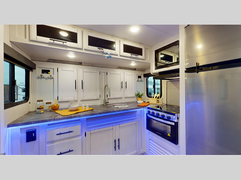Each Volante is constructed with a fully enclosed and forced air heated underbelly that will extend your camping season, and you're going to love the sleek look of the fiberglass front cap. Power stabilizer jacks make setting up camp easier than ever, and there is a power awning with LED lights so you can relax under once everything is unloaded from the truck. Head inside to find stainless steel appliances, premium residential furniture, a cozy fireplace, and many more comforts of home.