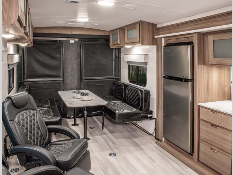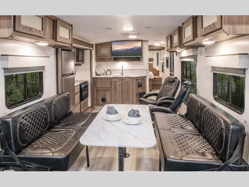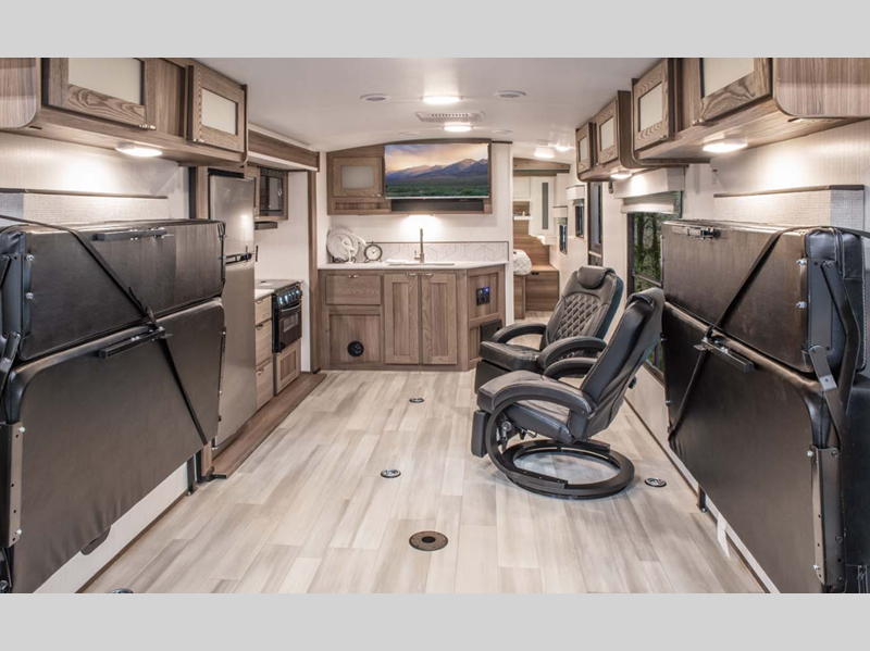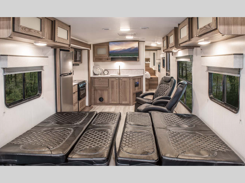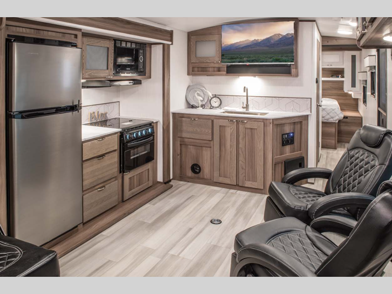 Each model features Azdel composite laminated walls, a fully molded, fiberglass cap, and a heated and enclosed underbelly to help extend your camping season. You'll also find hardwood residential cabinets with hidden hinges and seamless kitchen countertops. The exterior is just as impressive with triple entry steps with a telescoping handrail, power stabilizer and tongue jacks, and a 30" black glass main entry door.