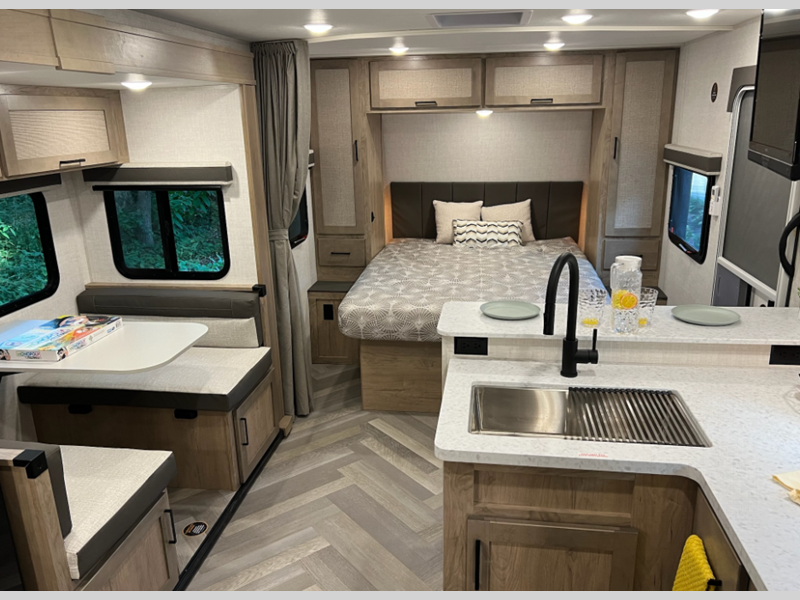 Sleeps 3 Slides 1 Length 21 ft 10 in Ext Width 8 ft Ext Height 11 ft 3 in Int Height 6 ft 10 in Hitch Weight 550 lbs GVWR 5690 lbs Fresh Water Capacity 55 gals Grey Water Capacity 35 gals Black Water Capacity 35 gals Furnace BTU 20000 btu Available Beds Queen Refrigerator Type 12V Refrigerator Size 10 cu ft Convection Cooking Yes Cooktop Burners 2 Shower Size 30" x 36" Number of Awnings 1 LP Tank Capacity 20 lbs Water Heater Type Tankless On Demand AC BTU 18000 btu Awning Info 14' Electric Axle Count 1 Number of LP Tanks 2 Shower Type Standard Electrical Service 30 amp Similar Floorplans