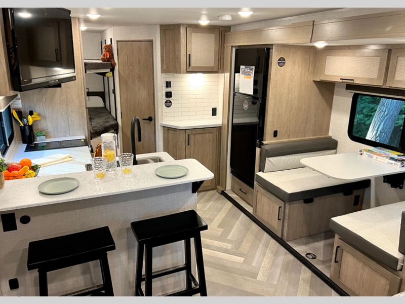 Sleeps 7 Slides 1 Length 23 ft 4 in Ext Width 8 ft Ext Height 11 ft 3 in Int Height 6 ft 10 in GVWR 5580 lbs Fresh Water Capacity 55 gals Grey Water Capacity 35 gals Black Water Capacity 35 gals Furnace BTU 20000 btu Number Of Bunks 2 Available Beds Queen Refrigerator Type 12V Refrigerator Size 10 cu ft Convection Cooking Yes Cooktop Burners 2 Shower Size 30" x 36" Number of Awnings 1 LP Tank Capacity 20 lbs Water Heater Type Tankless On Demand AC BTU 18000 btu Awning Info 16' Electric Axle Count 1 Number of LP Tanks 2 Shower Type Standard Electrical Service 30 amp Similar Floorplans