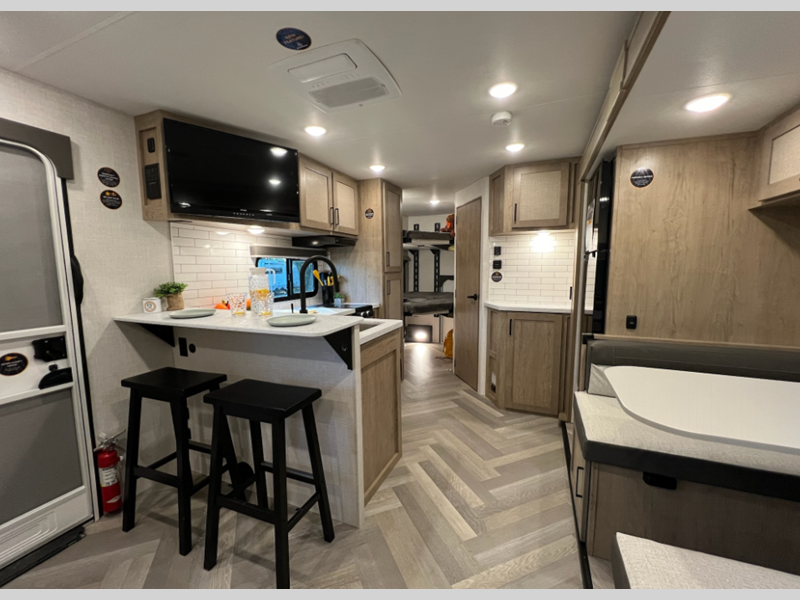Sleeps 6 Slides 1 Length 31 ft 7 in Ext Width 8 ft Ext Height 11 ft 2 in Int Height 6 ft 10 in Hitch Weight 670 lbs GVWR 7595 lbs Dry Weight 6100 lbs Cargo Capacity 1495 lbs Fresh Water Capacity 55 gals Grey Water Capacity 70 gals Black Water Capacity 35 gals Furnace BTU 30000 btu Number Of Bunks 2 Available Beds Queen Refrigerator Type 12V Refrigerator Size 10 cu ft Convection Cooking Yes Cooktop Burners 2 Shower Size 30" x 36" Number of Awnings 1 LP Tank Capacity 20 lbs Water Heater Type Tankless On Demand AC BTU 18000 btu TV Info LR 12V HD Smart TV Awning Info 18' Electric w/Dimmable LED Light Axle Count 2 Number of LP Tanks 2 Shower Type Standard Electrical Service 30 amp Similar Floorplans