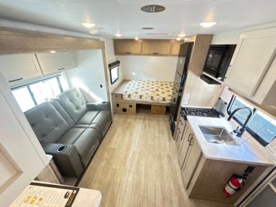 Time at the campground in this travel trailer will be time well spent. Once you arrive at your destination, you can put out the 14' electric awning, unpack the pass-through storage, then head inside for lunch. There is an air fryer convection microwave plus a dual burner cooktop to make meals each day, and the 10.6 cu. ft. 12V refrigerator will keep your food fresh. A legless dinette slide provides a place to dine together and even let a guest sleep over. If you're not needing the extra sleeping space, just choose the optional theater seating! You'll find the front queen bed will give you a great night's rest, and there is a full rear bath on board that will allow you to freshen up each morning. This model also includes a flexible interior/exterior storage locker with washer/dryer prep, giving you more space to store gear and the ability to wash clothes while at the campground!