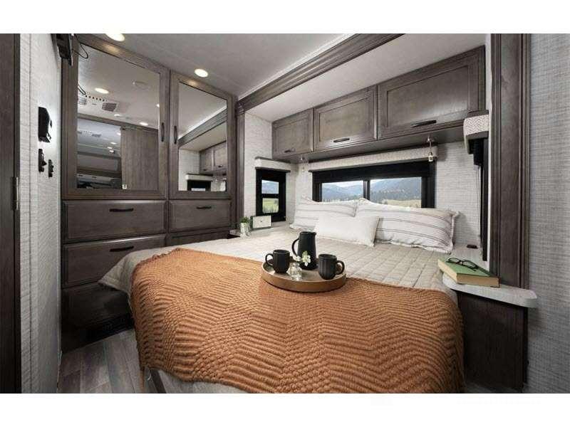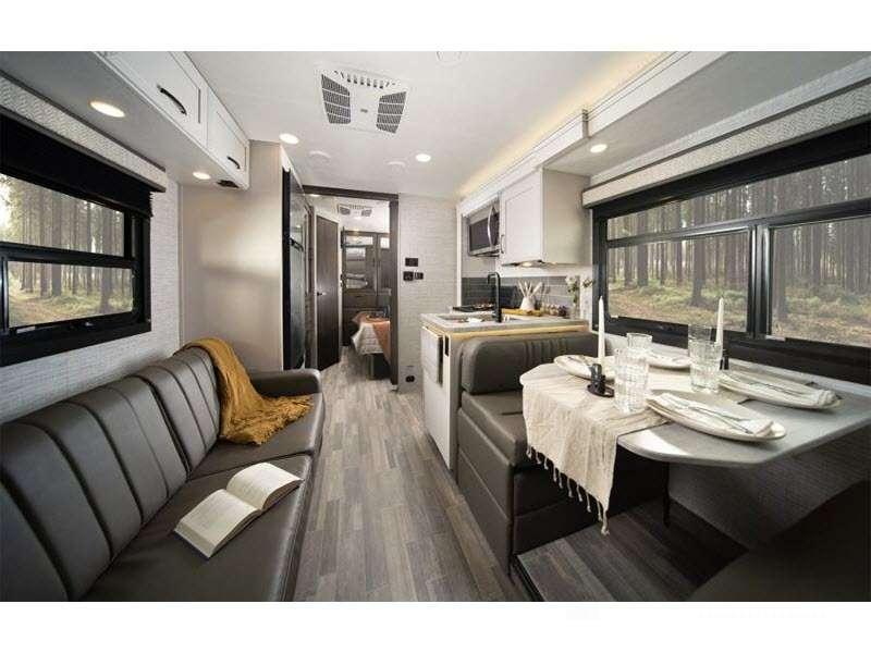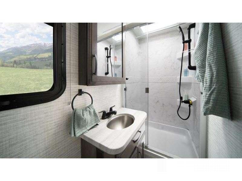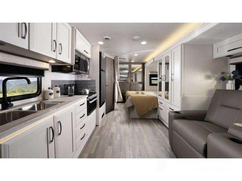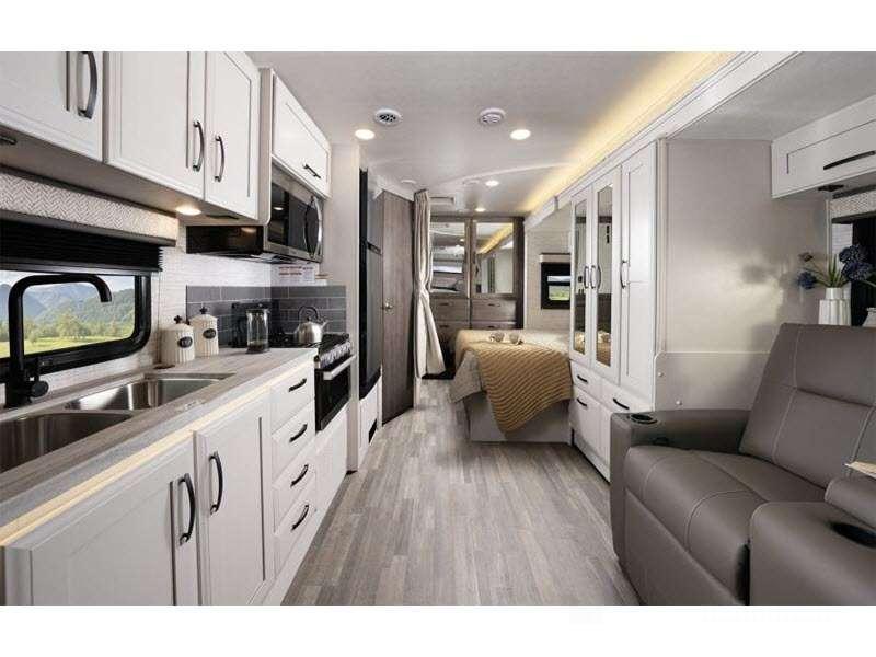 Sleeps 8 Slides 2 Length 29 ft 11 in Ext Width 8 ft 4 in Ext Height 11 ft 8 in Int Height 7 ft Interior Color Ashbrook, Modern Farmhouse Exterior Color Standard Graphics, Partial Paint Hitch Weight 7500 lbs GVWR 14500 lbs Fresh Water Capacity 42.5 gals Grey Water Capacity 41 gals Black Water Capacity 31 gals Tire Size LT225/75R16 Furnace BTU 30000 btu Generator Onan 4,000 watt MicroQuiet Fuel Type Gasoline Engine 7.3L V8 Chassis Ford E-450 Horsepower 325 hp Fuel Capacity 55 gals Wheelbase 195 in Number Of Bunks 1 Available Beds King Torque 450 ft-lb Refrigerator Type 12V Refrigerator Size 10 cu ft Cooktop Burners 3 Shower Size 30" x 36" Number of Awnings 1 Axle Weight Front 5000 lbs Axle Weight Rear 9600 lbs LP Tank Capacity 12.2 gals Water Heater Capacity 6 gal Water Heater Type Gas/Electric DSI AC BTU 15000 btu TV Info LR LED HD Smart TV, Ext. LED TV Awning Info 18' Electric with LED Lights Gross Combined Weight 22000 lbs Shower Type Standard Electrical Service 30 amp Similar Floorplans