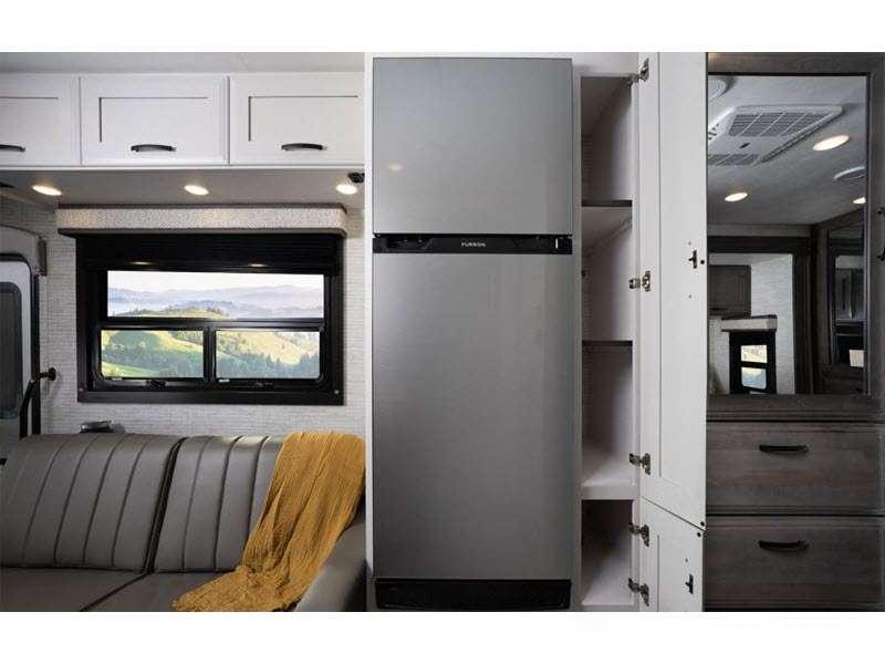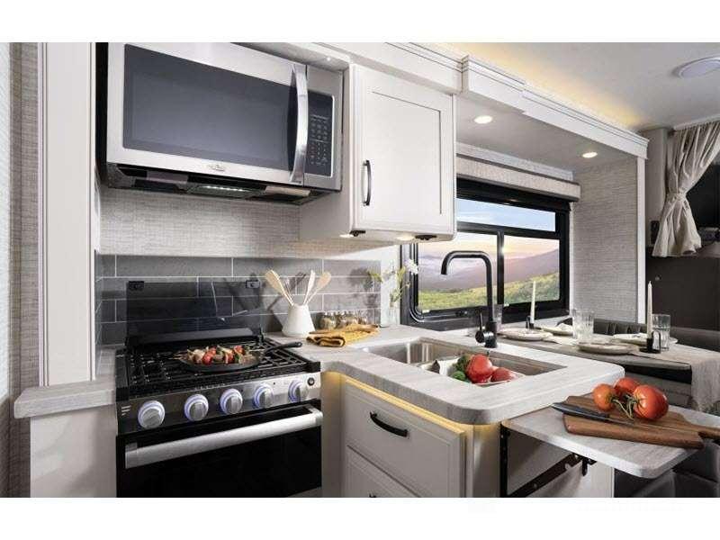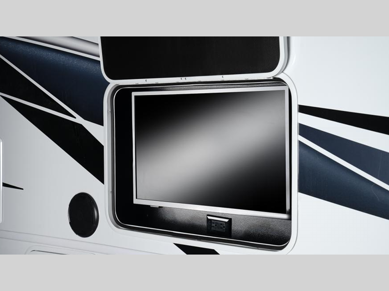 - E-Z Drive™; Automotive-bonded panoramic window in front cap with power shade; Frameless windows; Heated holding tanks (12V pads); Electric patio awning with LED lights; Black tank flush; Sony® infotainment center with Apple CarPlay® and Android Auto™; Backup and side-view cameras; LED HD Smart TV in living area