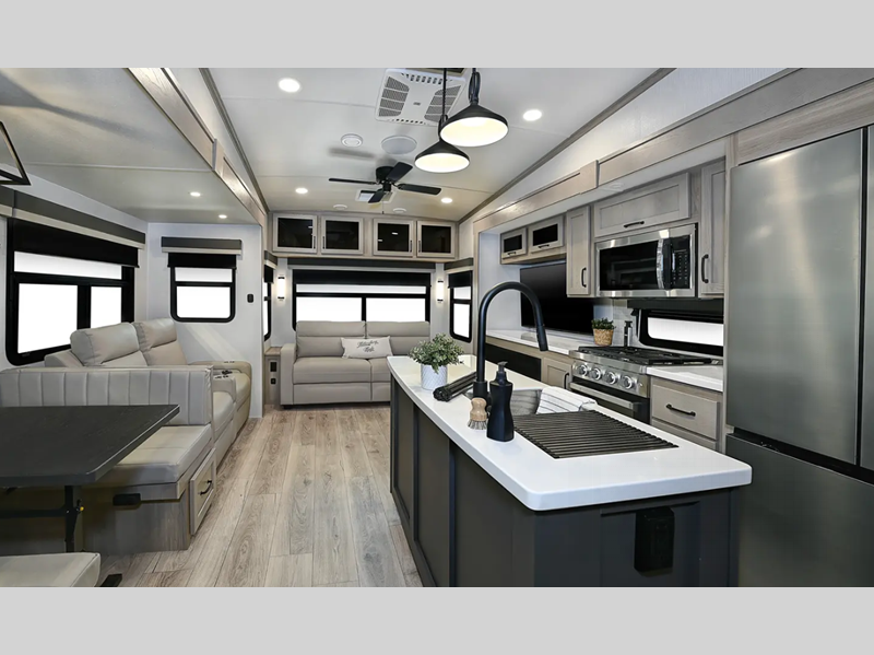 Sleeps 4 Slides 2 Length 34 ft Ext Width 8 ft Ext Height 13 ft 4 in Hitch Weight 1717 lbs Dry Weight 9884 lbs Cargo Capacity 2233 lbs Fresh Water Capacity 54 gals Grey Water Capacity 92 gals Black Water Capacity 53 gals Tire Size 16" Furnace BTU 35000 btu Available Beds Queen Refrigerator Type 12V Cooktop Burners 3 Number of Awnings 2 LP Tank Capacity 30 lbs Water Heater Capacity 12 gal Water Heater Type Quick Recovery Gas/Electric TV Info LR Smart TV Awning Info 10' and 15' Power with Adjustable Rain Dump & LED Light Strip Axle Count 2 Number of LP Tanks 2 Shower Type Standard Electrical Service 50 amp Similar Floorplans