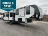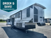 Each fifth wheel is constructed with an vacuum bonded aluminum structure with laminated aluminum sidewalls, slide boxes, a front wall and floor, plus one-piece Tufflex PVC roofing for more strength. The exterior offers a black tank flush, winterization and sanitation an enclosed docking station, and off-grid camping including a solar on the side prep. The interior includes residential linoleum, blackout curtains and roller shades, residential backsplash, and oversized opening windows for great views and circulation of natural air.