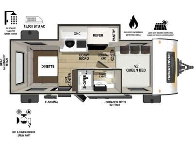 Sleeps 4 Slides 1 Length 20 ft 4 in Ext Width 8 ft Ext Height 9 ft 10 in Hitch Weight 370 lbs Dry Weight 3049 lbs Cargo Capacity 1721 lbs Fresh Water Capacity 30 gals Grey Water Capacity 30 gals Black Water Capacity 30 gals Available Beds Queen Refrigerator Type 12V Black Glass Convection Cooking Yes Cooktop Burners 2 Number of Awnings 1 Water Heater Type Tankless AC BTU 15000 btu TV Info 12V TV Awning Info 8' Power Axle Count 1 Shower Type Standard Electrical Service 30 amp Similar Travel Trailer Floorplans