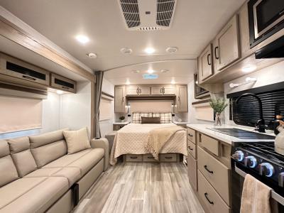 Sleeps 3 Slides 1 Length 22 ft 4 in Ext Width 8 ft Ext Height 10 ft 3 in Hitch Weight 557 lbs Dry Weight 4493 lbs Cargo Capacity 1344 lbs Fresh Water Capacity 54 gals Grey Water Capacity 29 gals Black Water Capacity 29 gals Furnace BTU 20000 btu Available Beds RV Queen Refrigerator Type 12 Volt Cooktop Burners 3 Number of Awnings 1 LP Tank Capacity 30 lbs Water Heater Type Quick Recovery AC BTU 15000 btu TV Info LR 12V TV Awning Info 14' Power with Adjustable Rain Dump and LED Lights Axle Count 2 Number of LP Tanks 2 Shower Type Radius Solar Wattage 200 watts Similar Travel Trailer Floorplans