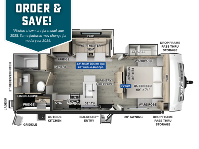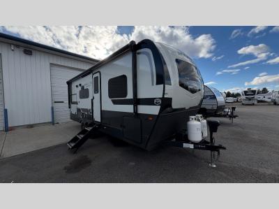 This is the perfect travel trailer for two people looking for comfortable camping trips! You will have your own RV queen bed to sleep on in the front private bedroom, and an optional TV can be added if you enjoy the morning news in bed. Breakfast can be made on the three burner cooktop, or head outdoors to cook on the outside kitchen. The theater seating with a table will provide a place to relax and dine together, and the spacious full rear bath will allow you to clean up before you head out for the day. This model includes plenty of storage space, including two pantries, a wardrobe slide out in the bedroom, plus a drop-frame pass-through storage for larger camp gear!