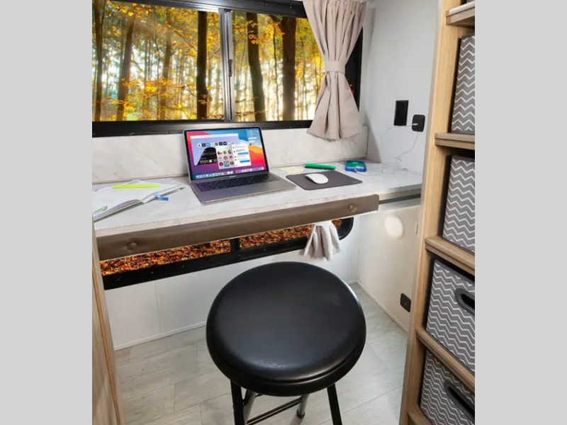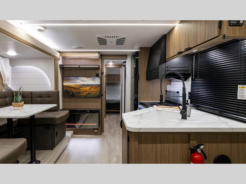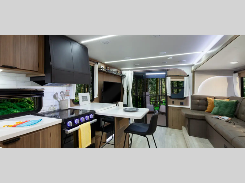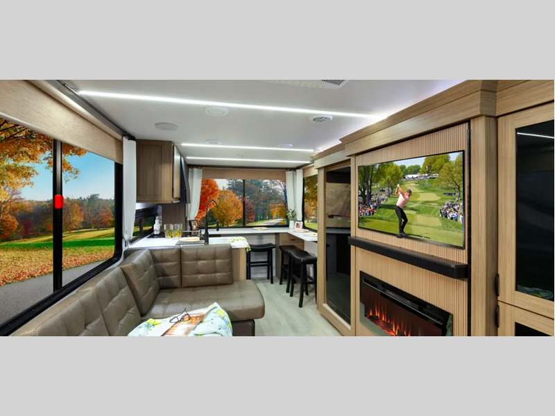 There are stylish window shades inside, along with TFL cabinet doors, upgraded backsplash, plus elegant curtain rods and curtains to make you feel more at home. You will also appreciate some of the best-in-class features such as, an enclosed Accessibelly for added protection, exterior accent lighting, a powder coated I-beam frame, and seamless holding tanks.