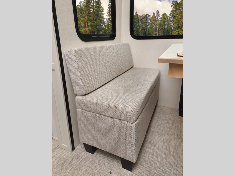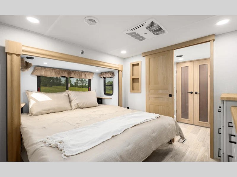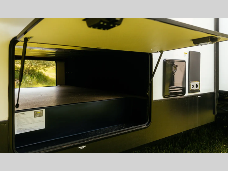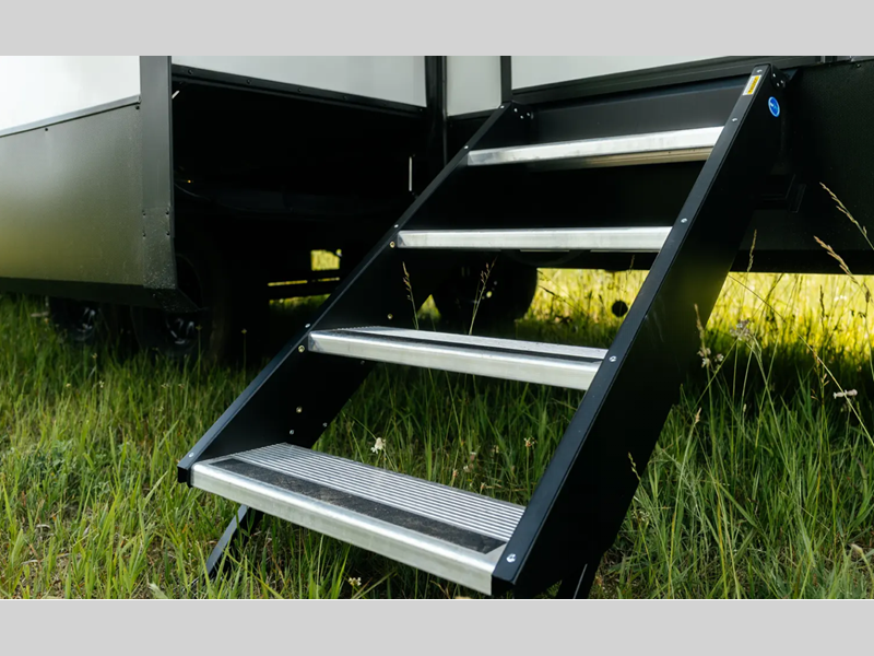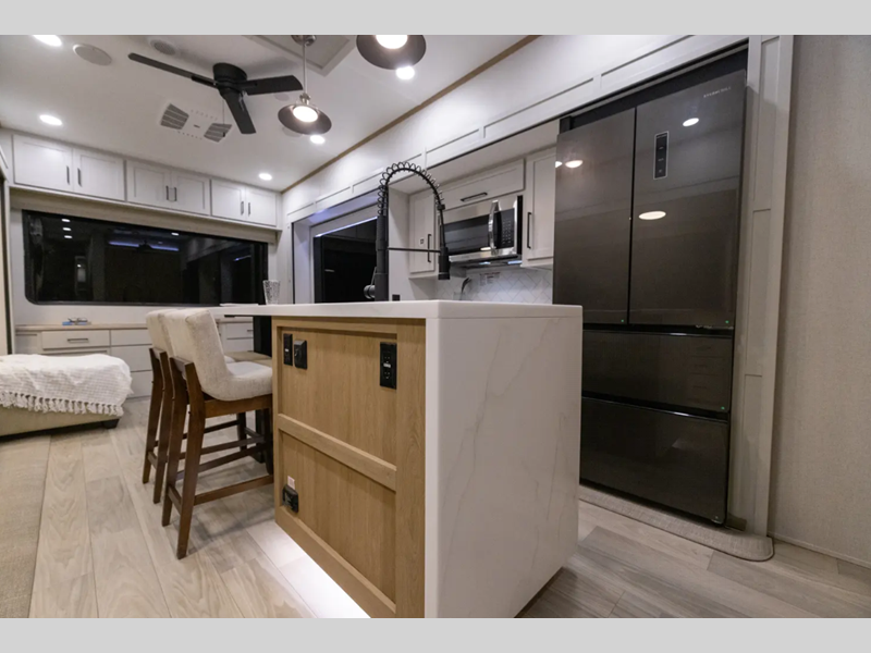 The electric leveling system included makes setting up a breeze allowing you to start having fun sooner. The underbelly armor will protect your unit's vitals from road debris and the painted two-tone aerodynamic fiberglass front cap with improved turning radius will make it easier to maneuver. You'll also enjoy Rich Solar 200W roof mounted solar panel with controller and battery, an on demand tankless water heater, two 15,000 BTU A/C units, and more amenities to make camping hassle-free. And the cook in your group will love the Chef collection 3 burner over with drawer, complete with solid surface countertops, decorative backsplash, and a spacious 12V refrigerator to name a few features.